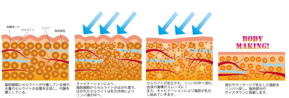 キャビテーションは、他の細胞に影響がないことがすでに臨床実験によって確認されており、医学的に安全が立証されているダイエット法です。 エステでは、その衝撃により脂肪細胞を破壊し、乳化を引き起こすことによって脂肪の減少を計ります。 その効果から、「メスのいらない脂肪吸引」とも呼ばれています。